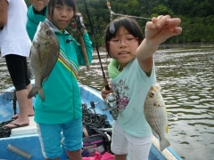 あいにく干潮の時間であったらしく、マングローブの間を狙うのではなく、岩の近くを狙ってキャストして引いてくるという釣り。ショートバイトは何度かあったが、魚のサイズが小さいのか乗らない。餌釣りをしている3人は順調に釣れているので我慢できずに餌釣りに変更。エビを餌に少し誘うとすぐにクンクンッという小気味よい魚信が出る。20センチくらいのナンヨウチヌを中心に、ホシミゾイサキ、フエダイなどが入れ食いモード。魚は相当濃いらしく4人で釣りまくる。30センチくらいのナンヨウチヌや40センチのゴマフエダイを追加してその夜の食材は十分にゲット。子供1号、2号は釣り飽きたらしく岸に上陸してトビハゼやシオマネキを捕獲して遊びだす。へた釣りも大物狙ってルアーを振るも……餌ではあんなに釣れるのにルアーには反応なしでこの日の釣りは終了。