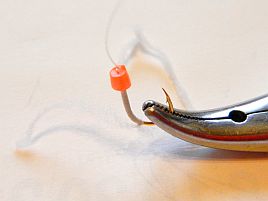 「シュリンクパイプ」もフロートパイプ同様、チモトに被せて収縮させて使う。ドライヤーで温めるとチモト部にぴったりくっつく。これがあれば夜光ビーズなどを枝スに通さなくても、針のチモトが光っているわけで、目玉キャップよりも水の抵抗が少ないし、枝ス絡みの原因になることがあるビーズ類は不要になるしで、シンプルでありながらアピール力を確保できるのではないかと……想像している。本当は赤色も「シュリンクパイプ」でと考えたのだが、どうしたことか、夜光は1.2㎜径(収縮後0.6㎜)のものが売られていたが、赤色は2.4㎜径(収縮後1.2mm)のものしか売られていなかったので断念した。