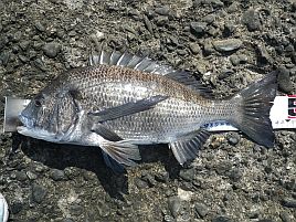 | クロダイが本命で磯釣りではなく堤防での釣りなので、メジナはあまり自慢できるようなサイズを釣ったことがない。伊豆大島の堤防で釣った35センチが人生最大なので、本格的にメジナ釣りをしている人からみると、何それ?ってレベルなのだが、本人楽しんで釣っているのでそっとしておいてほしい。足裏が釣れれば十分、足裏を超えれば満足なのだ。それ以上は……夢である。 |