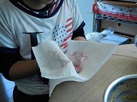切り身にしたアマダイをキッチンペーパーで水気を拭き取る。漬け地に付けると身から水分が出るので、この時点では余計な水分はキレイに拭き取っておく。