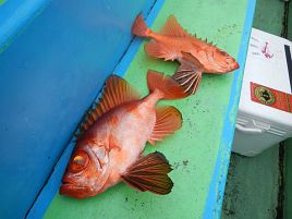 沖の瀬ではオキメバルが途切れることなく魚信り続ける。いい群れに当たると追い食いが発生するようで、オキメバルのコイノボリもあり着実に数を伸ばしていける。針数を5本に増やして欲張って釣っていると、フォースを2回達成した。一度だけ5本針に5匹の魚が付いたのだが、残念なことに一番下の針はヒメだった。ほかにもアカイサキがポツポツと混じる。オキメバルは釣れれば25センチ以上とサイズがよい。アカイサキは35センチ級が混じるので、お昼を前にしてクーラー八分目を達成する。このペースで釣るとクーラーから魚が溢れる予感がし始める。