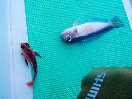 お土産確保に失敗してちょっぴり凹む。1匹くらいはと甘く見ていたことを反省する。船は20分ほど南下してアマダイのポイントへ。水深は80メートルくらい。底を小突いてアピールし50センチほど巻いてからさらにフワフワと誘うといういつもの釣り方で釣り開始。ゲストの魚信は少なめで周りを見ていると釣れればアマダイって感じだった。へた釣りの竿にもそれらしき魚信があったが…重量感が全く足りない。10センチのカナドと20センチのアマダイの一荷。すぐ横で30センチ級は釣れてるのに…やっぱり愛されてない?