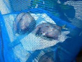 使っていたのはポリエチレンのメッシュになっている干しかご。玄関の郵便ポストからぶら下げて干していた。魚の臭いを嗅ぎつけたハエがやってくることはあるが網の中には入らない。一昨夜、三段になっている一番下の段の横の部分が何物かに噛みちぎられ干物を盗まれた。家の周りにはカラスが多いのでカラスの仕業とも考えたがカラスにそこまで鋭い牙はない。とすると、野良猫? 近所で目撃例のあるハクビシン? 病気などが怖いので破れた干しかごも残っていた干物も全部捨てることに。