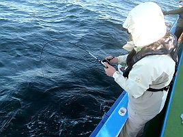 妻1号が先週の釣行で手応えをつかんだから間をあけずにもう一度行っておきたいと言うので、2週連続半日アジかぁ~と思いつつも妻の希望を優先したつもりだった。金沢八景・一ノ瀬丸より午前アジ。船長は一ノ瀬ジュニア船長だった。船長から「アジ釣りハマりそうなんですか?」と聞かれた妻が「一緒に行って欲しそうだったから来てあげた」と答えたのを聞く。ツンデレ? 俺の妻はツンデレなのか? 左舷は5人で出船となる。ポイントまで15分とのアナウンス。既にかなり風が強くなってきており飛沫を被りながら「おきのせ」のブイ近くのポイントへ。