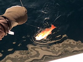 すっかり気をよくして第2投。2投目でもはっきりと竿をガコッと揺するような魚信あり。巻き始めるといい感じに抵抗するのでアカムツサイズアップの予感。船長からも「アカムツっぽい魚信でしたね」と言われてすっかりその気になっていたが、赤くない。35センチ級のクロムツ。アカムツに比べればクロムツなんてという人もいるが炙り刺しで赤黒食べ比べができるのでうれしい。続く3投目でも魚信がある。今度も竿を揺するような魚信ではあったが前2回に比べ迫力不足で、これまた35センチくらいのカゴカマス(≒スミヤキ)。お次は穂先に違和感ありで巻き上げると25センチくらいのユメカサゴ。このサイズなら喜んで持ち帰る。